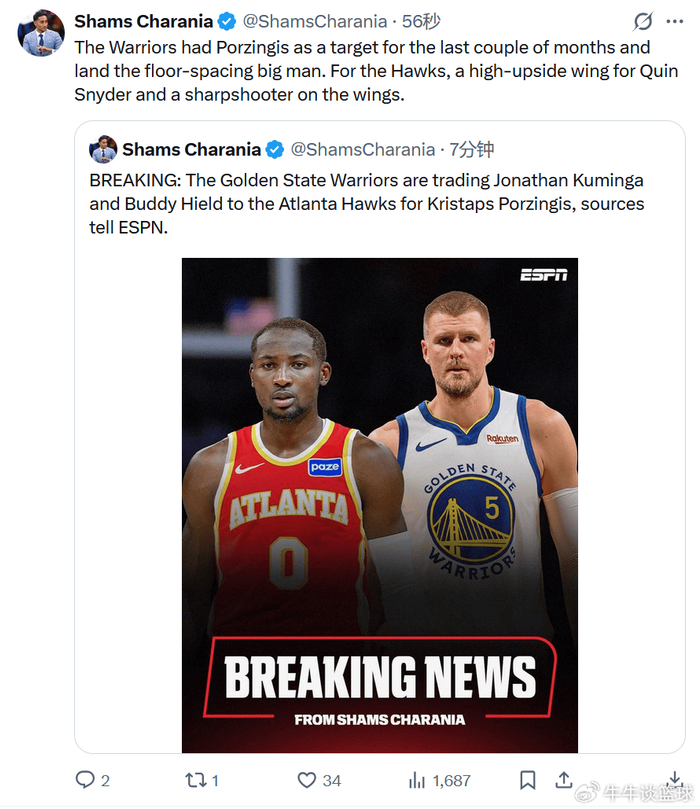 NBA常规赛继续进行。根据名记Shams的报道称,勇士队和老鹰队达成一笔2换1交易,勇士队送出库明加和希尔德,从老鹰队得到波尔津吉斯!随后勇士队和猛龙队达成交易,送走戴维斯到猛龙队,换回来自湖人今年的次轮!这笔交易为勇士队得到:波尔津吉斯;老鹰队得到:库明加、希尔德。据记者Jake Fischer补充报道,这笔交易不涉及任何选秀权。波尔津吉斯本赛季一共为老鹰...